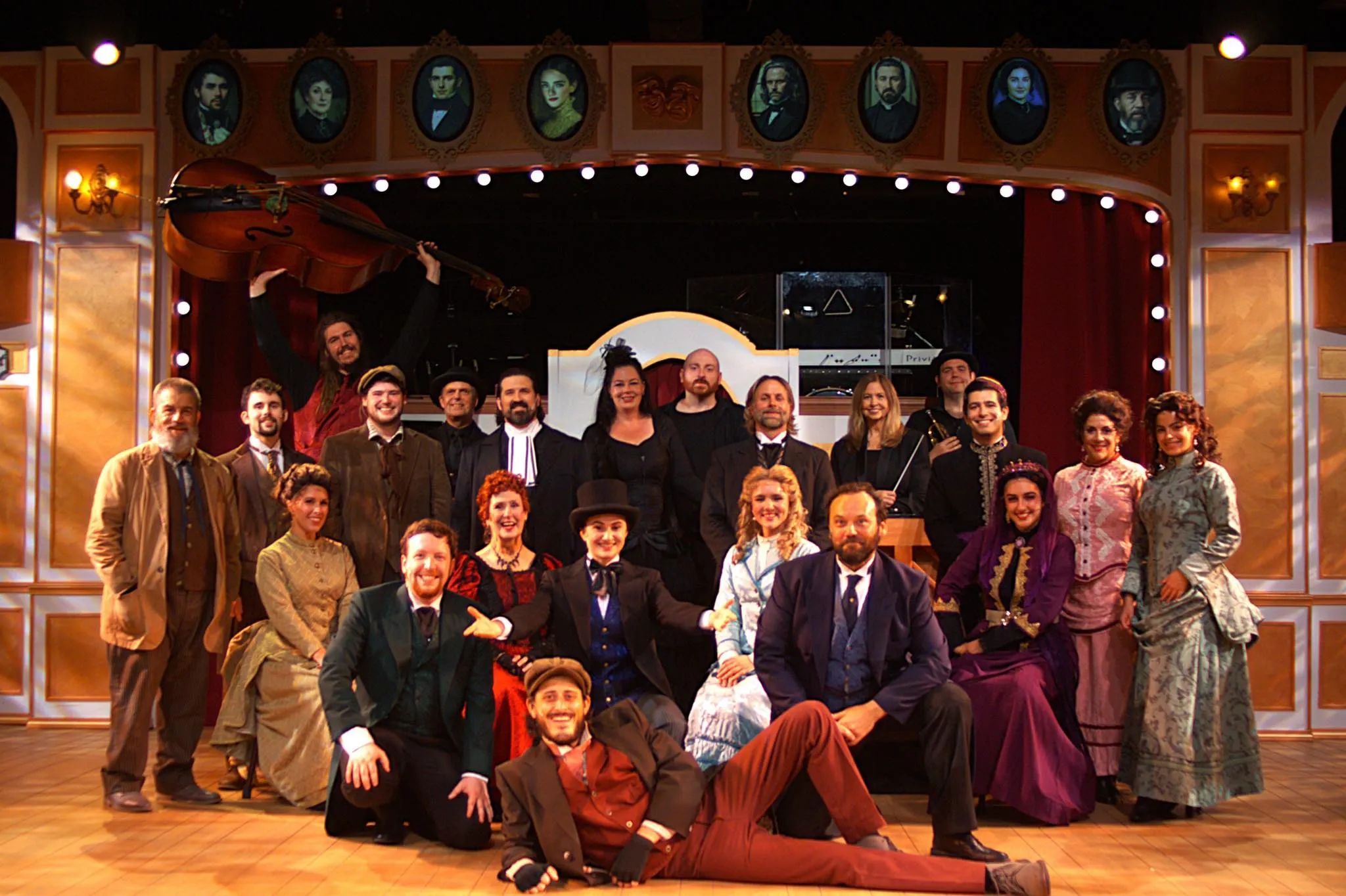 Dave Dionne’s set design transforms the Alhambra stage into the worn but whimsical Music Hall Royale, complete with Michael Roddy’s illustrated portraits of the possible murder suspects, each glowing to signal their appearance. It’s a delightful touch that helps the audience keep track of the colorful cast of characters, which is particularly handy in a show where participation determines the ending. Indeed, no two performances are exactly the same. The audience votes on who killed Edwin Drood, who loves whom and how the story concludes, giving each night its own unpredictable twist.